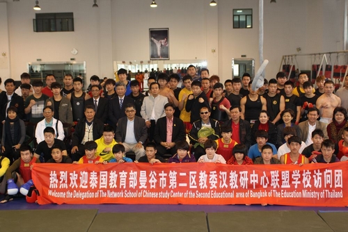 会上,SOMYOS SIRIBAN先生对辖区重点中学进行了详细介绍。苏明理院长与SOMYOS SIRIBAN 先生签署了就交换教师、学生等项目的友好协议。之后,访问团在武术系主任马文国的带领下,观看了我院武术系学生的精彩表演及散打比赛表演。