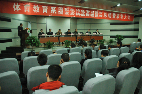 我院体育教育系于11月17日下午在教学楼一楼报告厅召开了“体育教育系国家级特色专业建设、国家级精品课程建设总结暨表彰大会”。院长苏明理、副院长权德庆、副院长周里及有关系部负责人应邀出席会议。