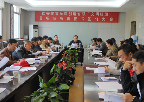 为推动学院创建省级“文明校园”工作健康有序开展,确保实现院党委提出2010年获得省级“文明校园”称号的目标,4月15日下午, 我院创建省级文明校园目标任务责任书签订大会在行政楼2楼会议室召开,学院领导、处级以上干部参加了会议。会议由苏明理院长主持。
