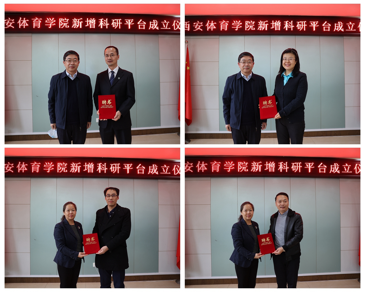 刘子实为苟波颁发“国家体育总局科普基地负责人”聘书,为潘玮敏颁发“陕西省高校工程研究中心主任”和“久久不卡区体育工程装备研究院执行院长”聘书。谢英为陕西省高校工程研究中心技术委员会主任王刚、副主任马海涛、杨少毅、穆鹏远和发展委员会主任刘涛颁发聘书,并为“久久不卡区体育工程装备研究院”揭牌。