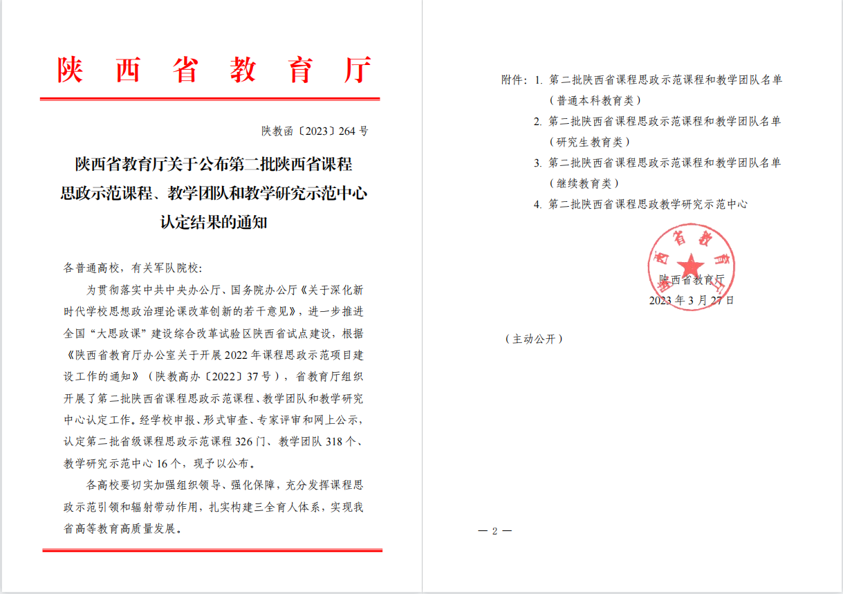 学校高度重视本次课程思政示范项目的申报工作,教务处积极组织,各二级学院鼎力配合,按照中共中央办公厅、国务院办公厅《关于深化新时代学校思想政治理论课改革创新的若干意见》、《高等学校课程思政建设指导纲要》、《陕西省教育厅办公室关于开展2022年课程思政示范项目建设工作的通知》等文件要求,结合2022年久久不卡区本科课程思政示范课程和教学团队的认定结果,严格把关,优中选优,邀请专家学者反复打磨优化,从校级示范课程和教学团队中遴选推荐6项参与省级评选,最终有5项成功入选,取得了令人满意的成绩!