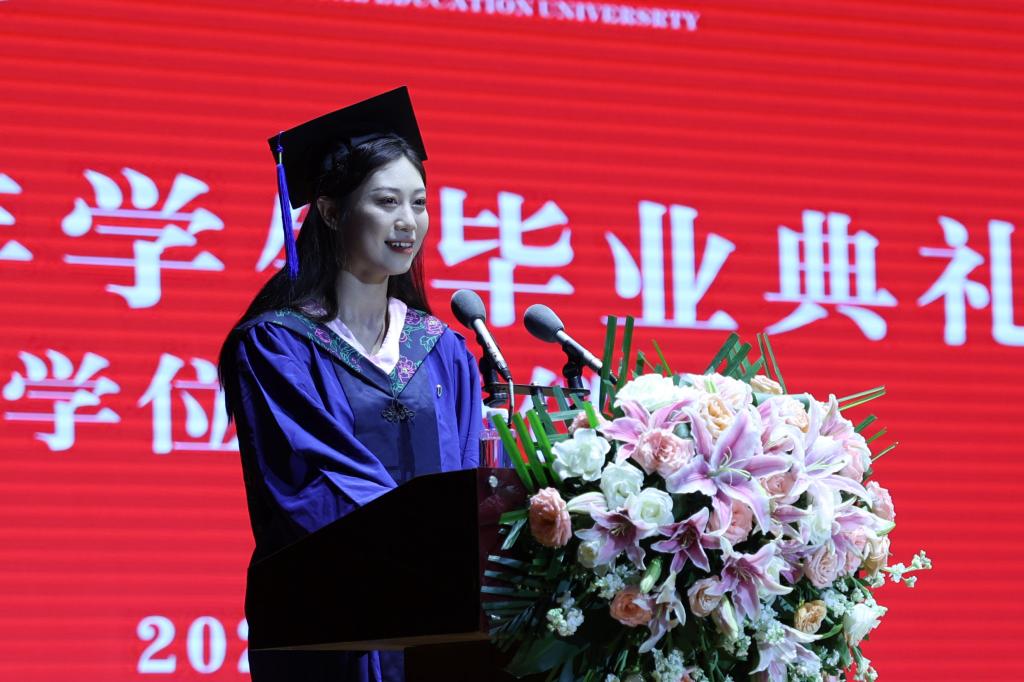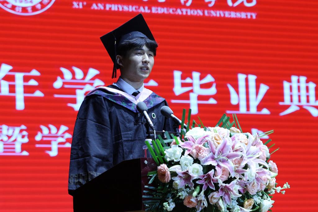 来自研究生部的杨紫璇和艺术学院的牛志远分别代表2023届毕业的硕士研究生和本科生发表了毕业致辞,对母校的辛勤培养、老师的谆谆教诲、同窗的相遇相伴致以最诚挚的感谢。他们代表所有毕业生发出铮铮誓言:将牢记“严谨、创新、团结、拼搏”的西体校训以“明是非、守原则、怀天下、奋力为”的立身之道,在人生道路上披荆斩棘,在各行各业展现西体风貌!