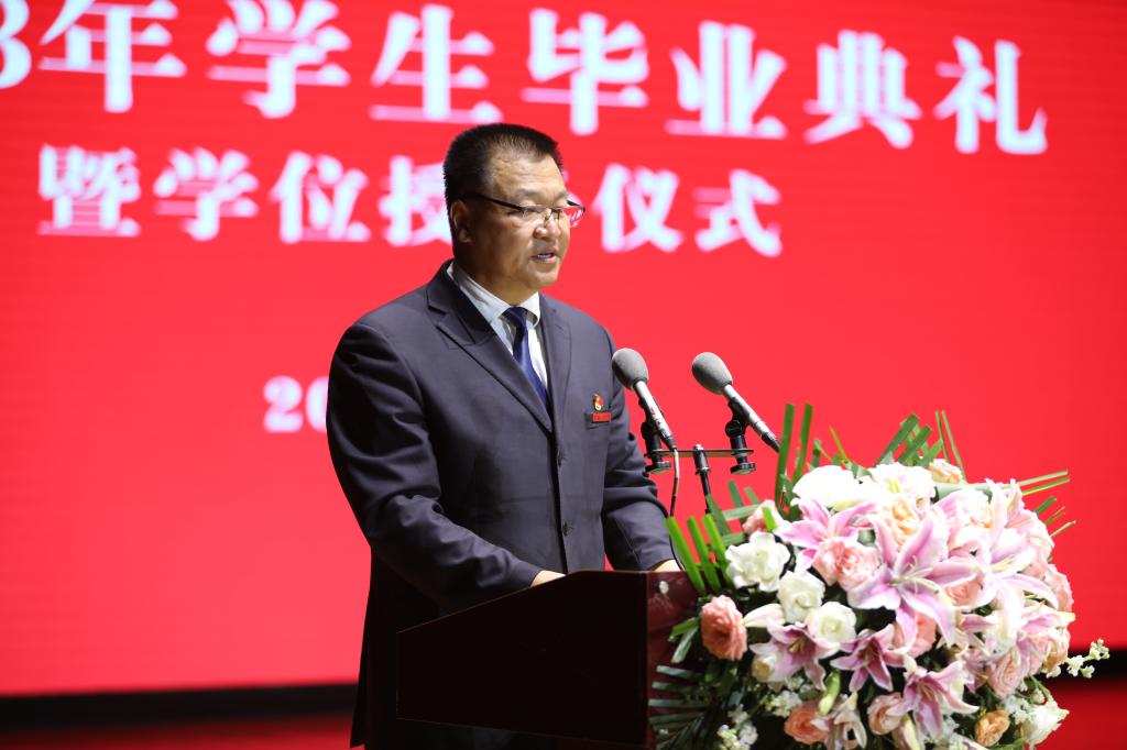 本网讯 6月28日上午9时,我校2023年学生毕业典礼暨学位授予仪式在艺术馆三大礼堂隆重举行。党委书记黄道峻,校长刘子实,党委副书记高玉峰、杨芳乾,副校长陈彦、刘新民、谢英、张卫国出席典礼。参加典礼的还有学校各职能部门负责人、各学院(部)领导、各教研室主任(支部书记)、教师代表、家长代表、毕业年级辅导员。典礼通过“现场+网络直播”的方式同步进行,近万人共同见证了2043位本科毕业生和402位硕士毕业生的青春告别仪式。典礼由副校长陈彦主持。