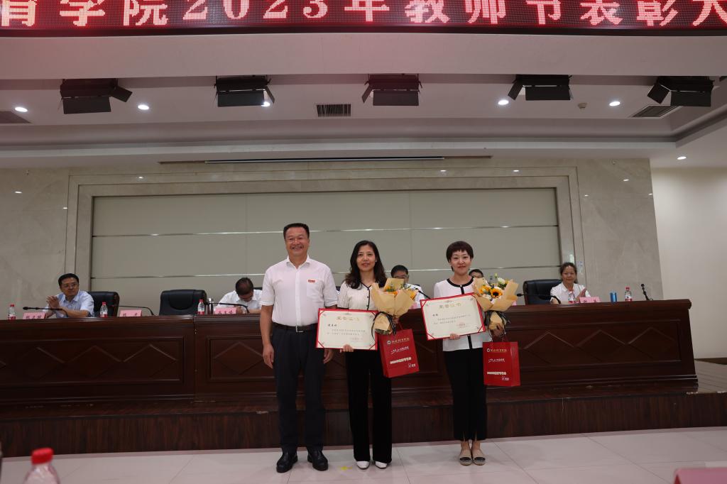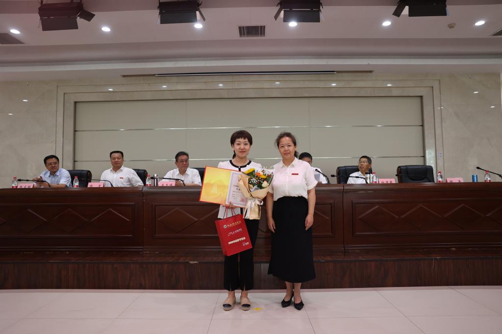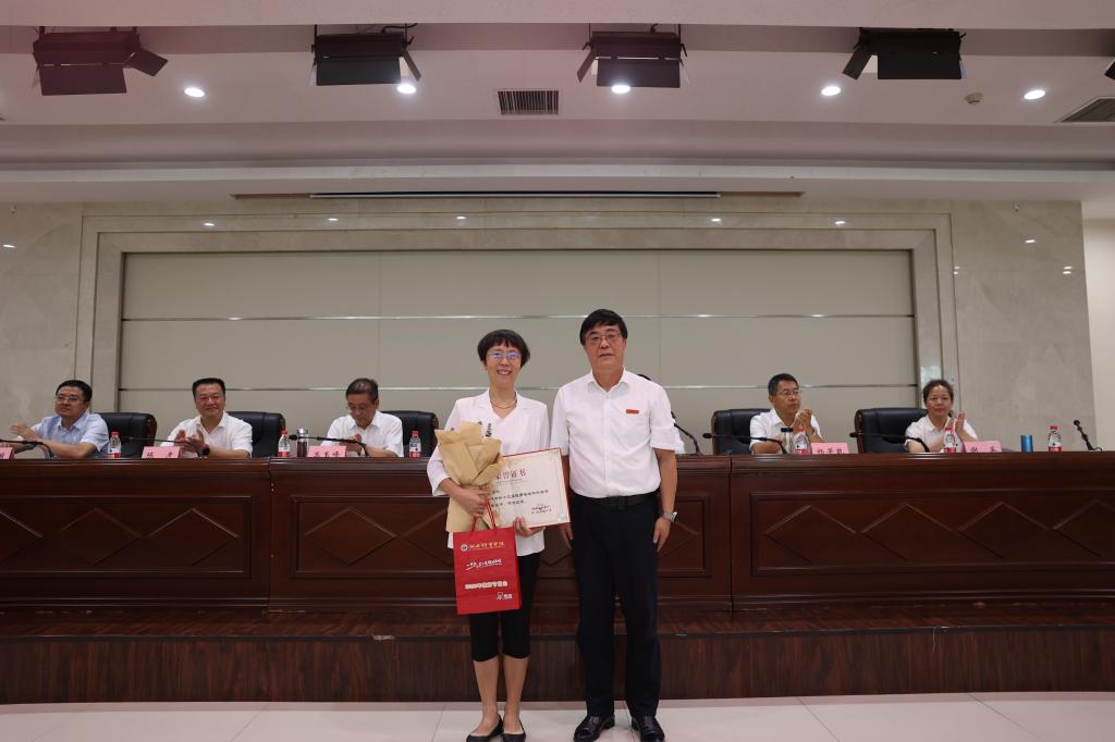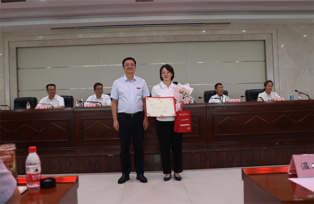 党委书记黄道峻给荣获第十三届陕西普通本科高等学校“教学名师奖”温晓妮颁奖。