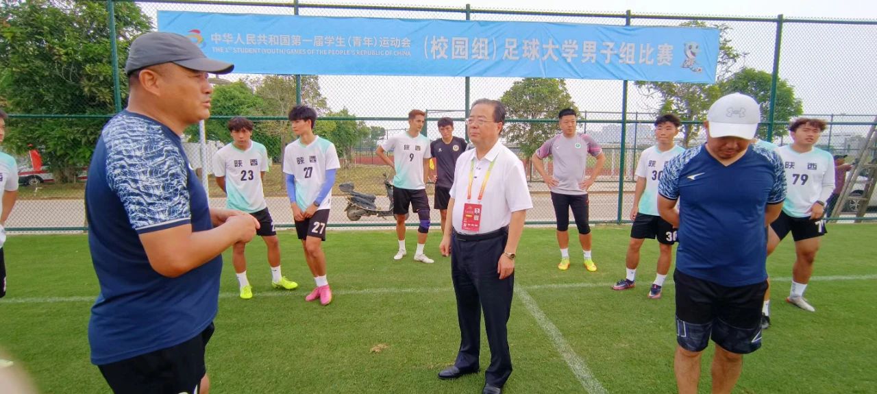 在足球项目代表队比赛场馆,王海波与我校教练员、运动员亲切交谈,全面了解赛程安排、备战情况,详细询问他们的生活起居和身体状况,并勉励大家要团结协作、勇于争先,做到赛出风格、赛出水平,争取优异的竞赛成绩。同时,他强调,要提高政治站位,统一思想共识,各教练组与工作人员全面做好学青会各项工作;发扬拼搏精神,勇于争创一流,努力在各项比赛中获得佳绩;严肃赛风赛纪,严守安全底线,用实际行动展现陕西代表团良好形象。