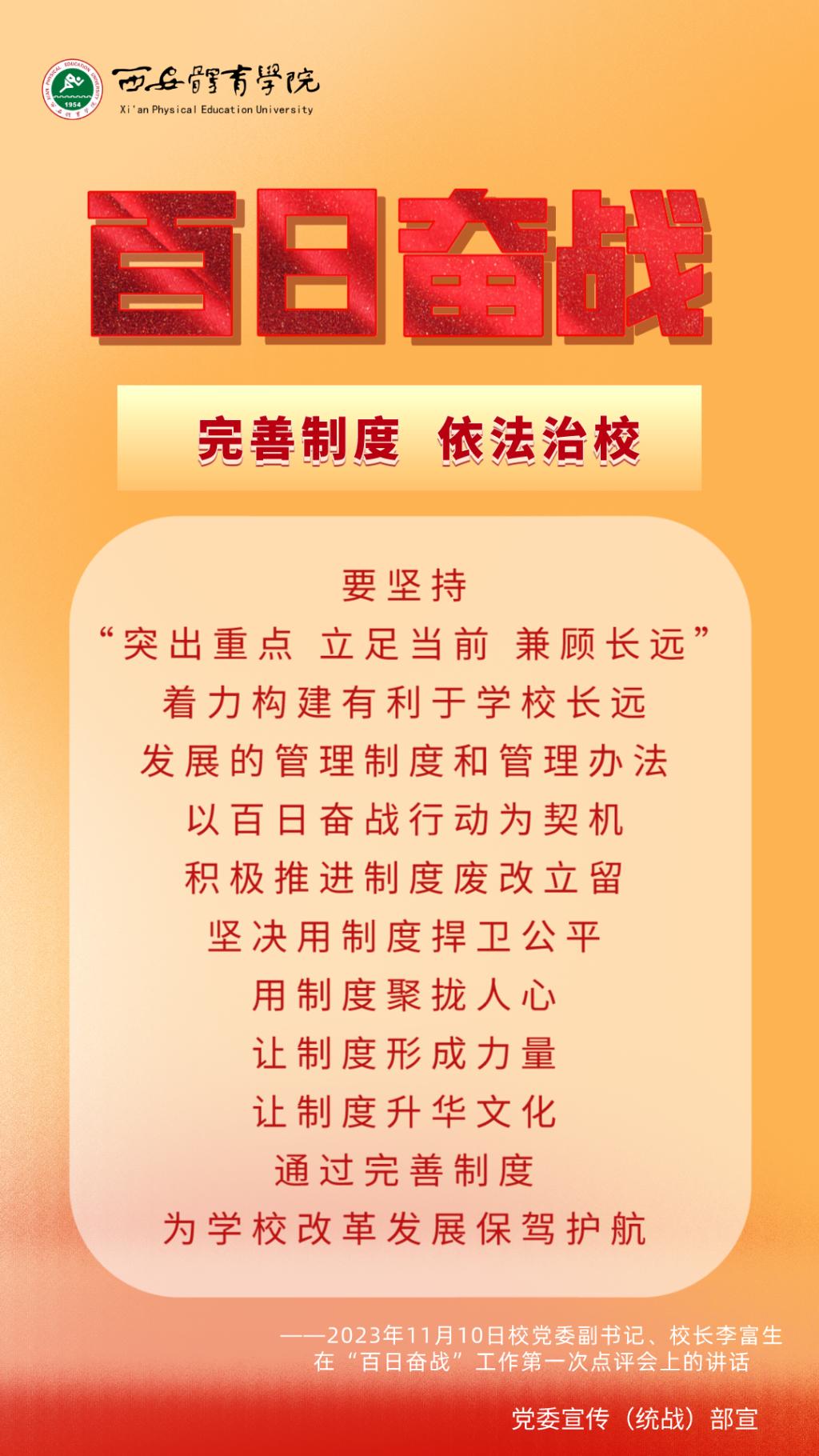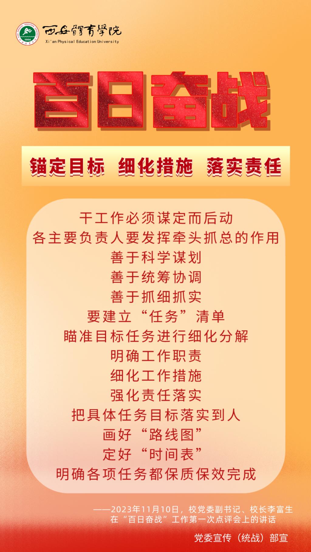 为持续掀起“百日奋战”的热潮,保持学校各项事业高质量发展的战略定力,动员全校师生员工为学校改革发展勠力同心、接续奋斗,本公众号以专栏形式陆续推出“百个要点”的“百张海报”,将“百日奋战”相关会议的主要会议精神和重点内容进行摘录报道,以供师生员工学习交流。