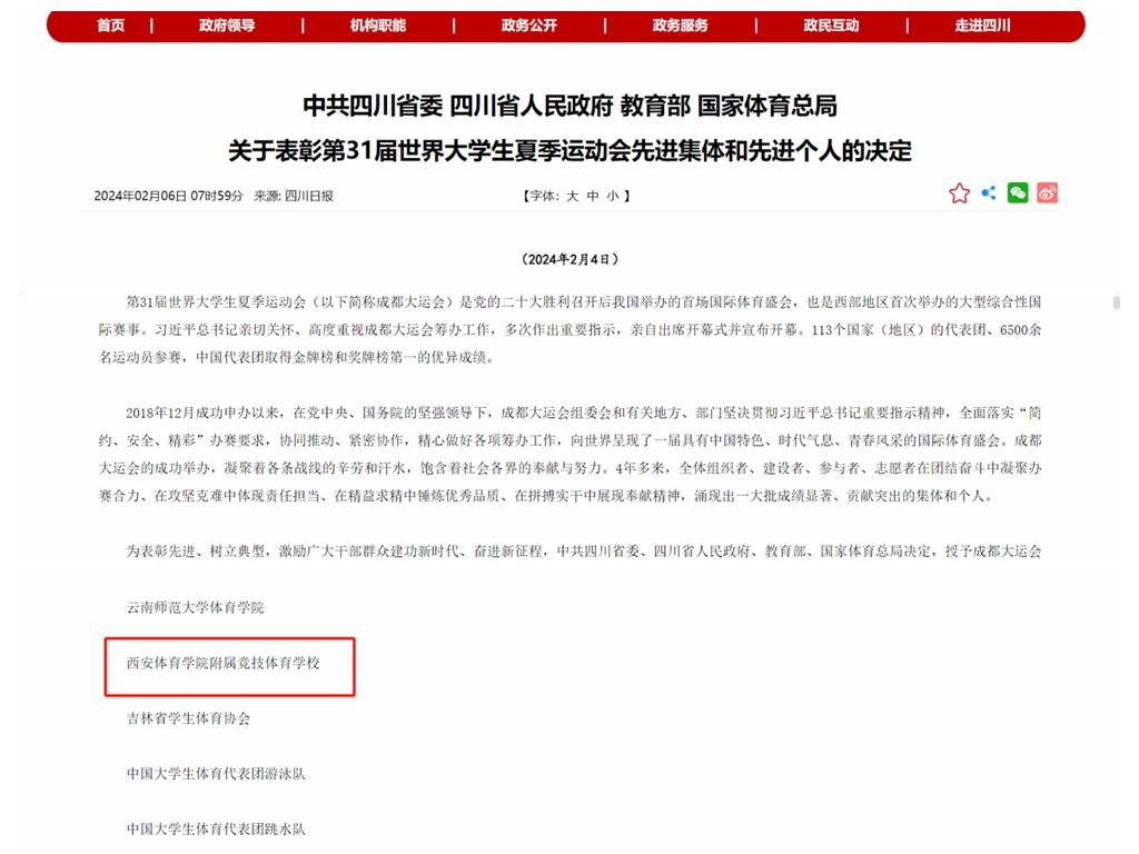 本网讯 2月6日,教育部、国家体育总局联合发布《关于表彰第31届世界大学生夏季运动会先进集体和先进个人的决定》,我校附属竞技体育学校因在本次世界大学生夏季运动会中的卓越表现,被授予“第31届世界大学生夏季运动会先进集体”称号。