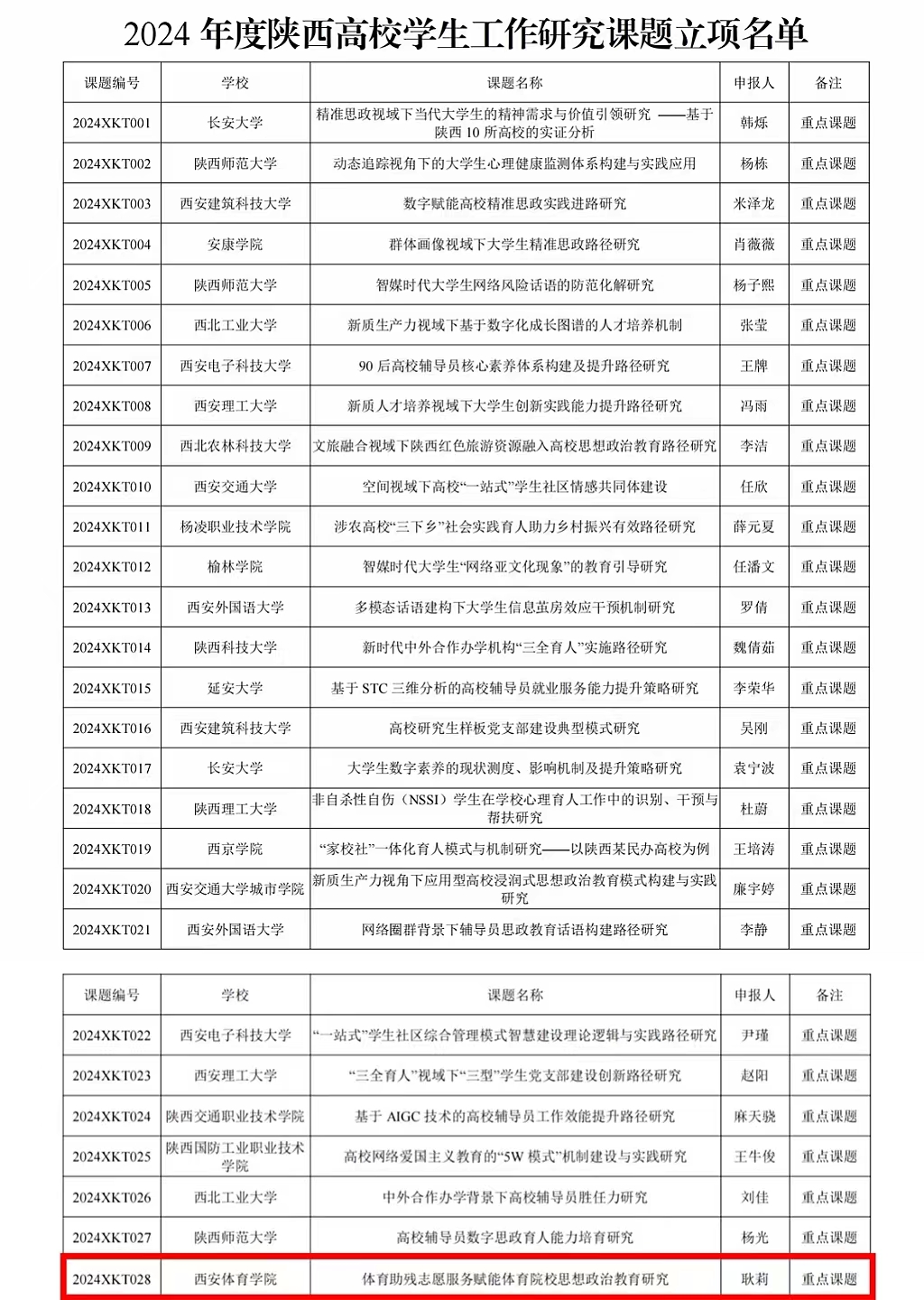 根据《中共陕西省委教育工委办公室关于开展2024年度陕西高校辅导员队伍素质能力提升工程系列活动的通知》(陕教工生办〔2024〕4号)精神,我校辅导员积极响应并参与,经过学校推荐、专家评审以及委厅审定,最终体育教育学院耿莉申报的《体育助残志愿服务赋能体育院校思想政治教育研究》获得重点课题项目立项;研究生部郭运涛《陕西省地方红色文化融入“大思政课”建设研究》、李婷《“三全育人”理念下网络思想政治教育对体育高等院校学生就业促进作用研究》获得一般课题项目立项。