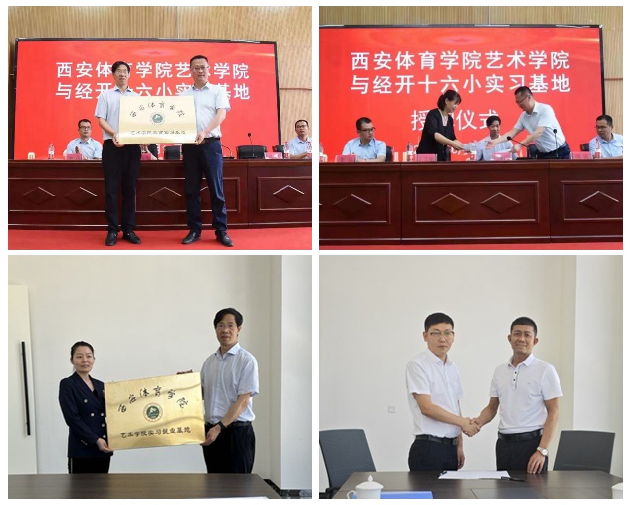 艺术学院与西安市经开第十六小学就两校合作内容,以及实习基地的共建方式进行了深入交流,双方一致认为应始终坚持以“立德树人”、“五育并举”的教育理念并将其融入实习基地建设中。艺术学院大学生艺术团和宣讲团为经开十六小的师生们带来了精彩的表演与党史教育宣讲。之后双方进行了实习基地签约授牌仪式。